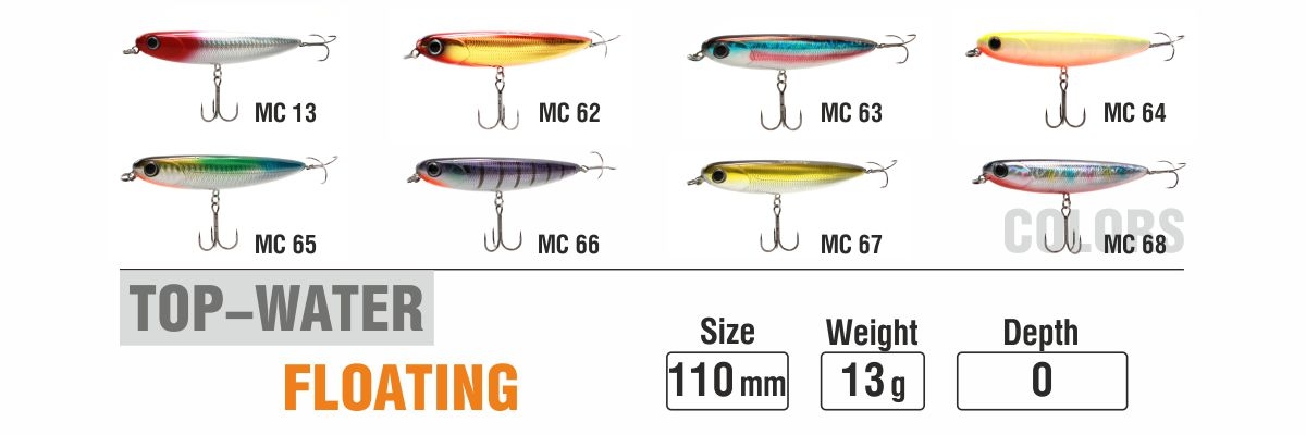 このルアーはテーパーシルエットがあるトップウォータープラグですが、同類と違って、もっとスリムなボーディがあります。EASY JIMMYのサイズは110ミリで、重さは13グラムです。外見は捕食魚の大好物である歐白魚です。