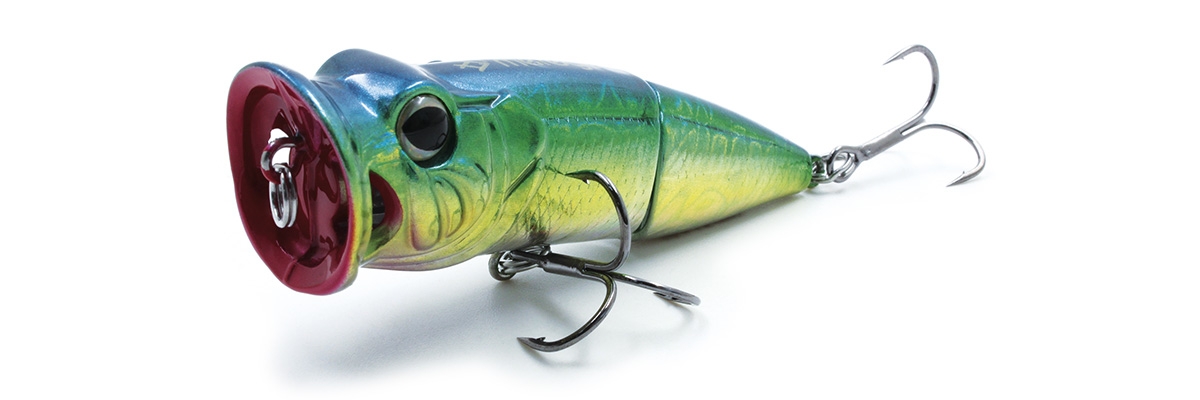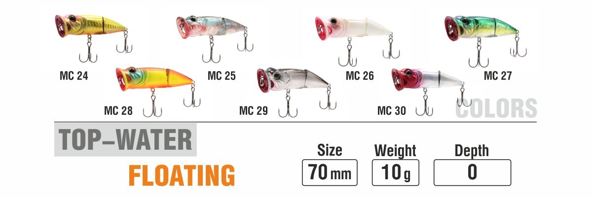 当ルアーは2つのパーツからなります。ヒンジに加えて、そのルアーの独特さは、ポッパーの頭部が通路を有し、その出口が鰓の領域の下や頭の側部に沿って位置するという事実にあります。そのようなシステムは、ルアーが動く時に水に大きな擾乱を作り、強い流体力学的歩道ができて、捕食魚の注意を引き付けるという目的のために設計されています。